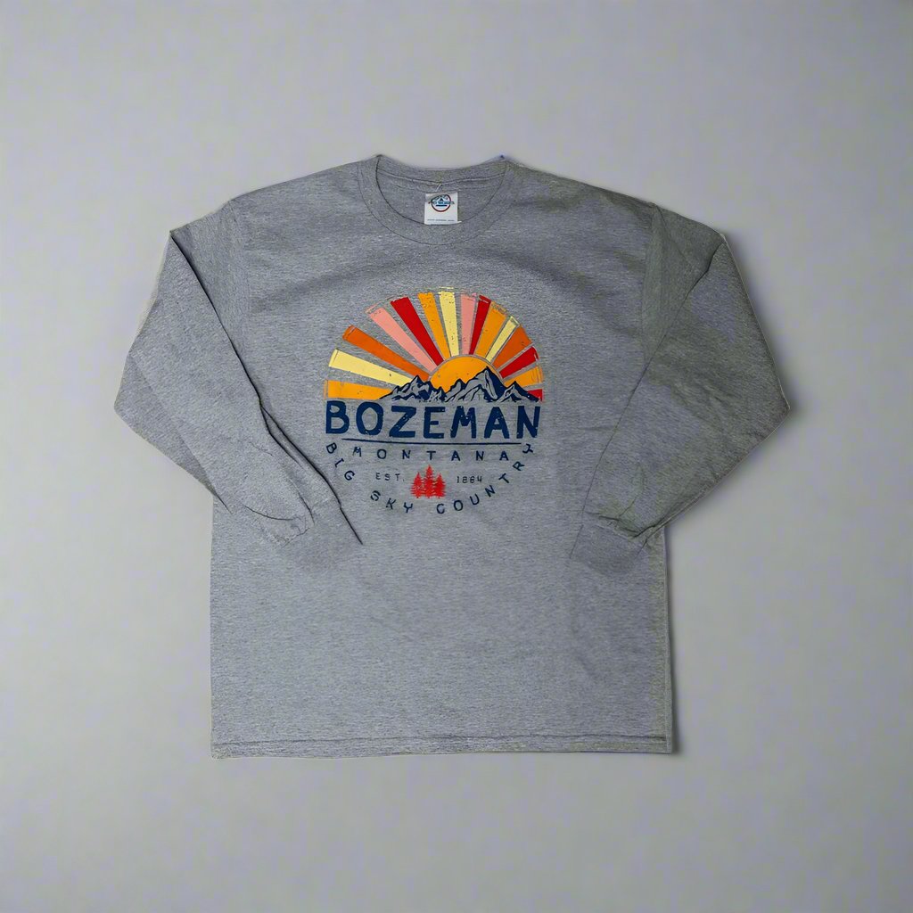Get your little one ready for adventure in this Youth Athletic Grey Long Sleeve Shirt by Prairie Mountain! Tt features a vivid Montana-inspired design that captures the beauty of watching the sunrise or sunset over the mountains. Perfect for the young explorer!