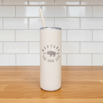 The BPA-free Montana The Good Life Bison Maker 20 oz Soft Matte Tumbler by Montana Gift Corral is essential for any outdoor enthusiast! Crafted by Save a Cup, this 20-ounce tumbler keeps your drinks icy cold for 24 hours and piping hot for 12, thanks to its durable 18/8 stainless steel and double-wall insulation. The powder-coated exterior, paired with a contrasting lid and matching straw, makes this tumbler both stylish and practical. Whether you've lived in the Big Sky State your whole life, or are just on an epic northwestern road trip, pick up this engraved insulated tumbler and get a taste of the good life!