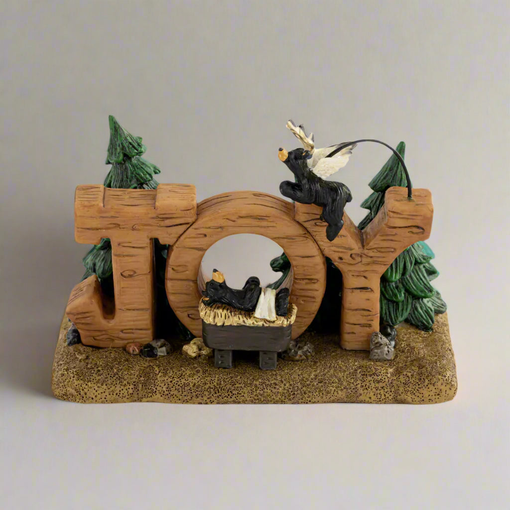 Decorating for the holiday season is made easy with Jeff Fleming bears! Our Bearfoots Joy Figurine by Jeff Fleming measures about 5"w x 2"d x 3"h and is hand-cast in resin for a durable finish that will last you for years to come. Inspired by Jeff Fleming’s original design, this piece is a heartwarming addition to any holiday display. It features letters that spell out JOY, framed by pine trees and a charming nativity scene, complete with a baby black bear and a black bear angel overhead. It's the perfect wildlife-inspired piece to add a little Montana to any room in your home.