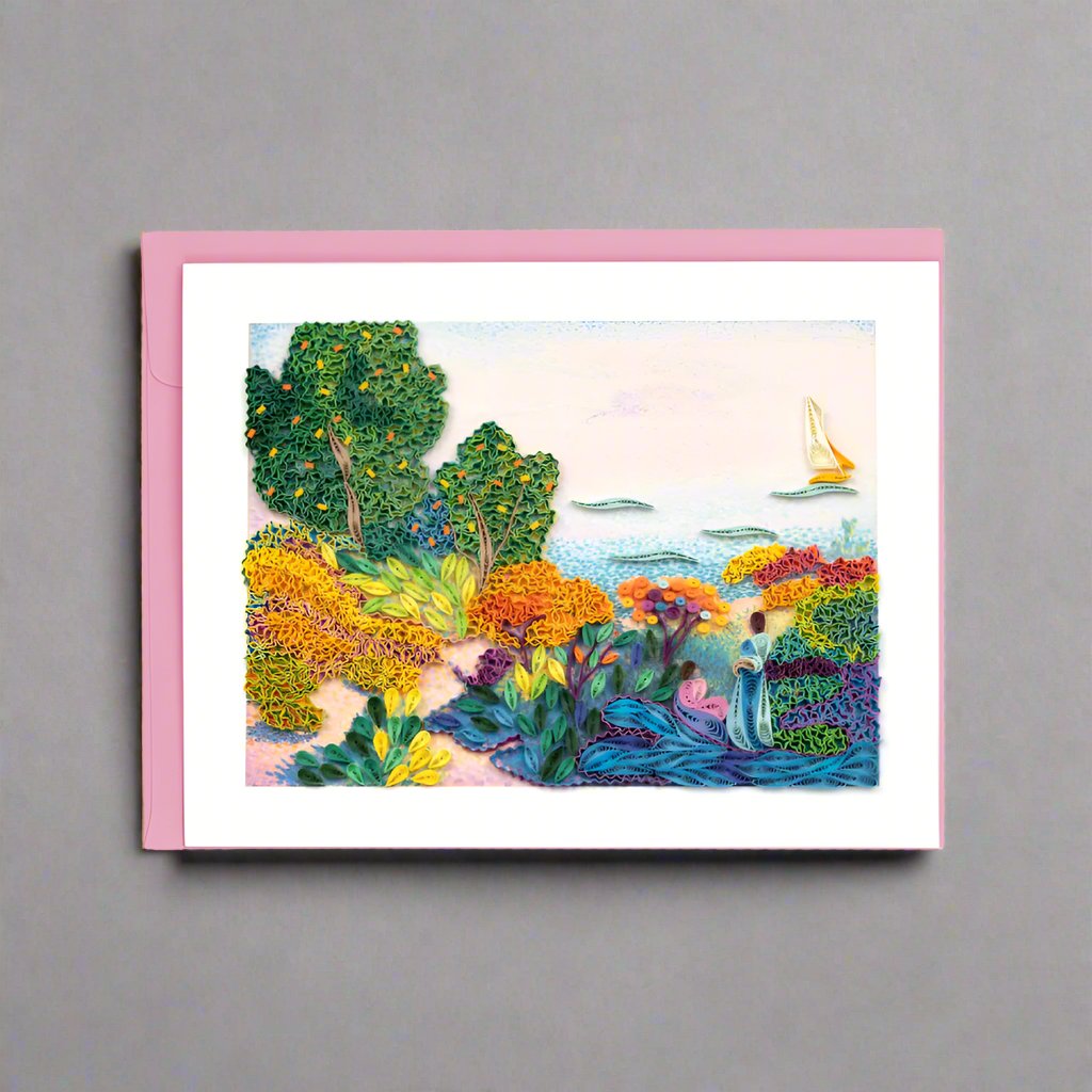 Experience the serene beauty of Henry Edmond Cross’s Two Women by the Shore Mediterranean with this elegant greeting card by Quilling Card. Through intricate paper quilling, this design reimagines the peaceful moment captured in Cross's painting, showcasing the soft colors and calm atmosphere of the Mediterranean. Each card is meticulously handcrafted over six hours, bringing the timeless elegance of the artwork to life in stunning detail. Perfect for art lovers or anyone who appreciates thoughtful craftsmanship, this card adds a touch of tranquility to any occasion.