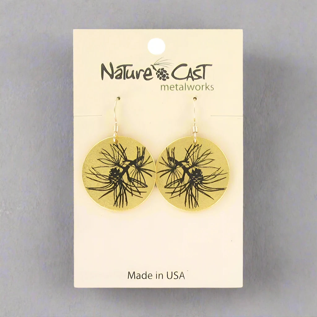 Long Needle Pine on Gold Dangle Earrings by Nature Cast Metalworks