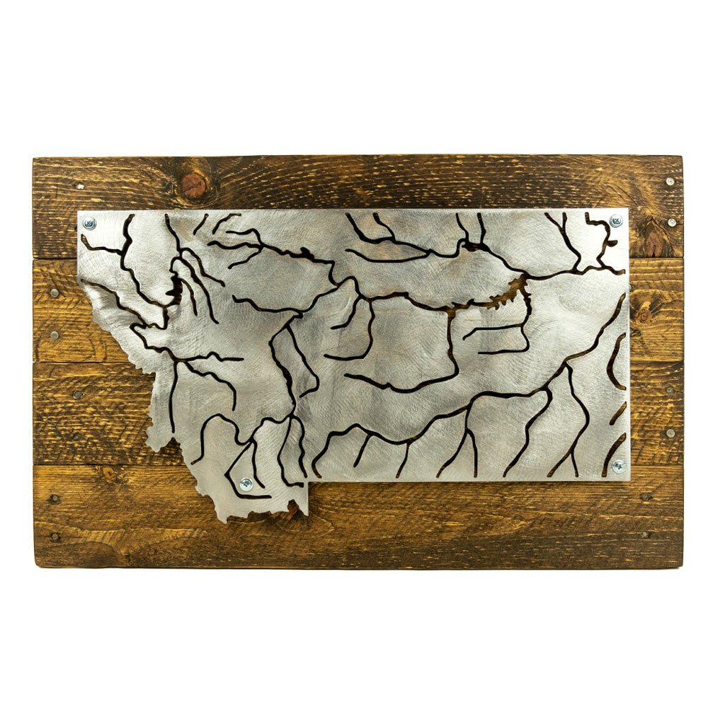 Beauty and durability; that's what you get when you place this Polished Montana Rivers on Dark Brown Wood Wall Art by Iron Bark Designs in your home. The husband and wife duo based out of Bozeman, Montana work hard to produce beautiful pieces to bring a bit of Big Sky Country into your home or office. Using a CNC machine, 12-gauge metal is laser cut and then polished for a finish that is resistant to tarnish and wear over time. Then, they use reclaimed wood. This piece is stained a cognac dark brown. On the back, you'll find pre-mounted hardware making this Montana wall art ready to hang!