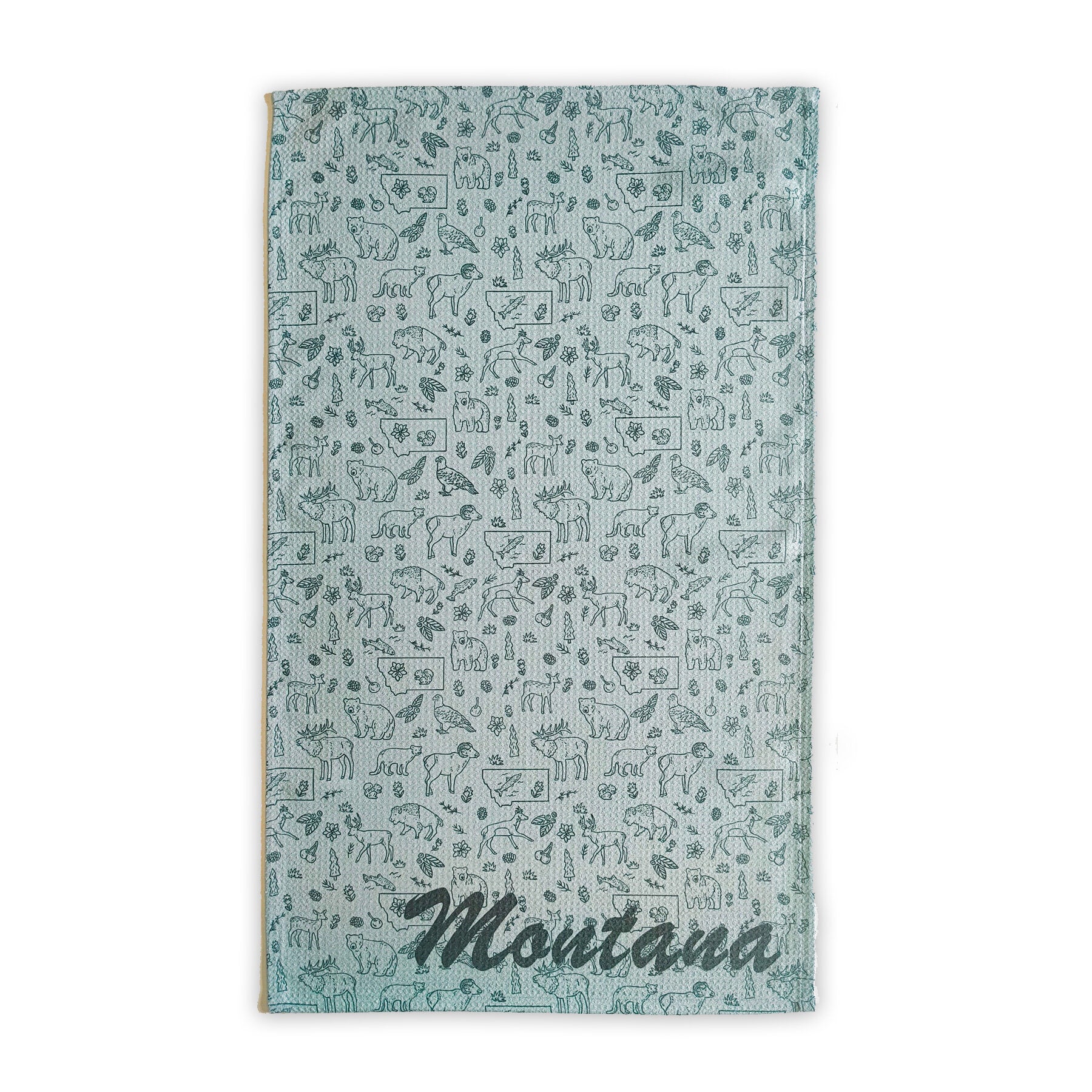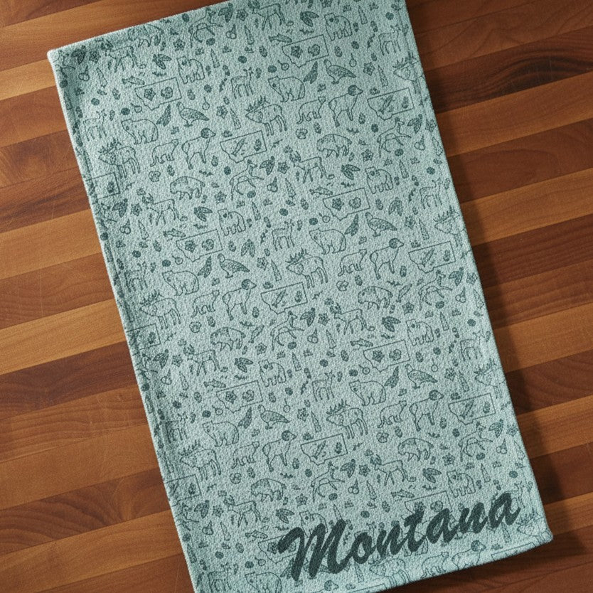 The kitchen is the soul of the home, a place where we create beautiful and delicious meals and share them with friends and family! It only makes sense to fill this space with the people and things we love most. Enter the Montana Microfiber Waffle Kitchen Towel by Corvidae Drawing and Design! Whether you’re new to the Big Sky State or have lived here your entire life, this towel is the perfect way to showcase Montana’s charm. Featuring a fun design of hand-illustrated Montana wildlife and the word “Montana,” it’s an everyday essential that adds a touch of joy to routine tasks. Printed on durable 80% recycled polyester and 20% recycled polyamide waffle-knit fabric, it’s super absorbent, holding up to seven times its weight, bringing a little Montana-inspired happiness and a whole lot of convenience to your kitchen!