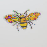 Colorful bee-shaped sticker with iridescent wings on a white background