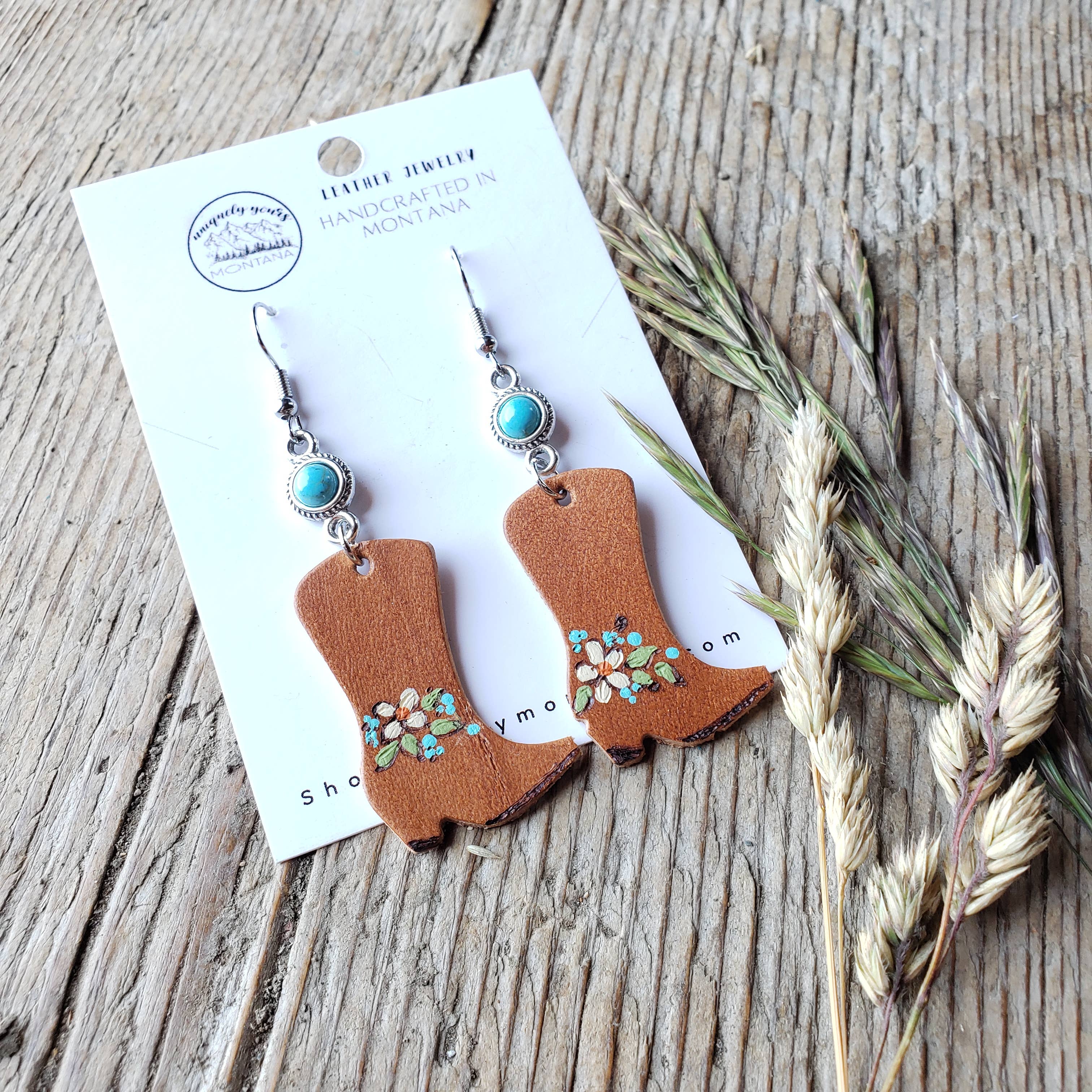 Say howdy to the Boot o’ Flowers Western Collection Earrings by Uniquely Yours Montana! Handcrafted in Florence, Montana, each pair begins with genuine leather and is brought to life with hand-etched and painted floral details. A touch of turquoise and silver adds just the right amount of shine, giving these boots a personality all their own. Lightweight and easy to wear, they’re finished with hypoallergenic ear wires for all-day comfort. Whether you're kicking up dust or heading to town, these earrings carry a bit of Montana with every step!