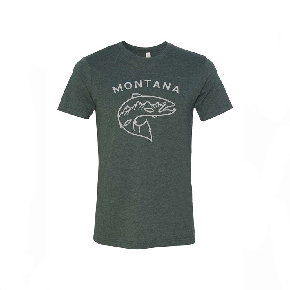 We love this Forest and Light Grey Trout T-Shirt. The quality of the material used to make this shirt is so soft and comfortable. It is also light weight and breathable, which makes it the perfect shirt to wear under the heat or underneath layers for when it is cold. The graphic on this shirt is simple yet stunning, with a trout outline that shows a mountain scape inside. It captures the essence of our fish filled landscapes here in Montana.