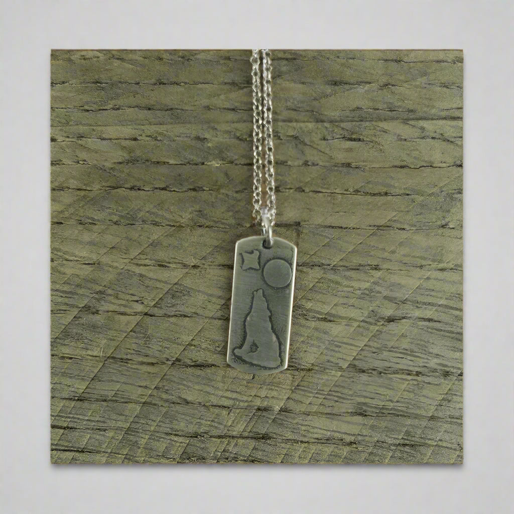 The Silver Howl Necklace by Daphne Lorna captures the wild spirit of the West in a way that feels raw and poetic. A lone wolf stands mid-howl, etched into a slender silver bar with a softly brushed finish that echoes moonlight on rugged terrain. The artwork is simple, but it carries weight, symbolizing freedom, instinct, and the quiet strength that comes from walking your own path. The silver chain is adjustable, letting you find just the right spot to wear this powerful little reminder of wild places and the strength that lives within you.