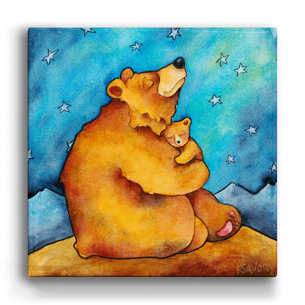 Introducing Karen Savory's Super Hero in the Making Bear with Cub Metal Box Wall Art! This playful and quirky piece, made in Montana, features a mama bear and her cub stargazing. Measuring 18 inches, it's a wild and wonderful addition to any space. Perfect for animal and art lovers alike, get yourself this quirky piece of Montana wall art!