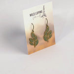 Pair of leaf-shaped earrings on a Wild Lupine Felicraft branded card.