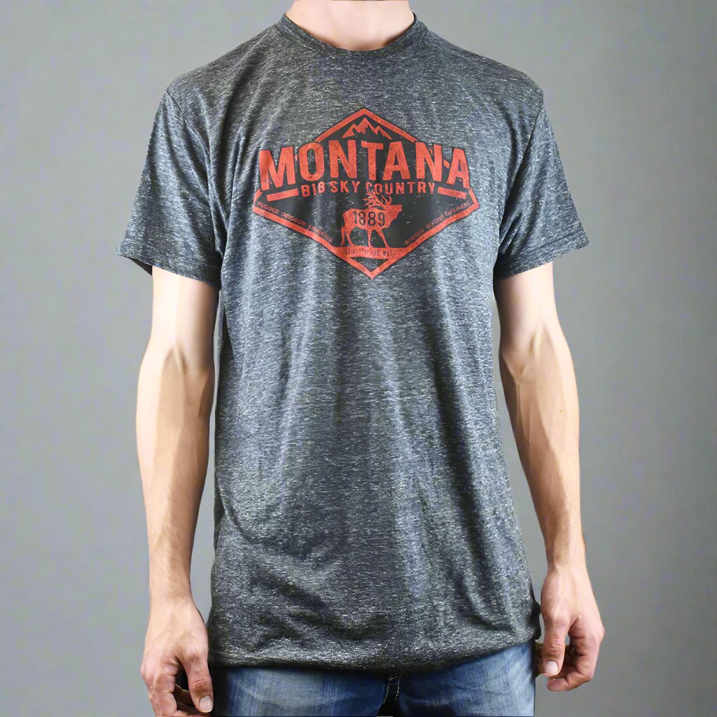 Show off your Montana pride with pride with the stylish Dynamic Mountain Montana Elk Tee Shirt by Prairie Mountain! The Dynamic Mountain Montana Elk Tee Shirt by Prairie Mountain is a comfy and casual shirt that is perfect for anything any time! The Dynamic Mountain Montana Elk Tee Shirt by Prairie Mountain features the word "Montana" in big bold red letters with the words "Big Sky Country" written just underneath. Silhouetted against the dark grey backdrop is a red elk, a beloved and popular Montana resident. With the Dynamic Mountain Montana Elk Tee Shirt by Prairie Mountain, you'll always have a piece of the Big Sky Country with you, no matter how far from home you roam.