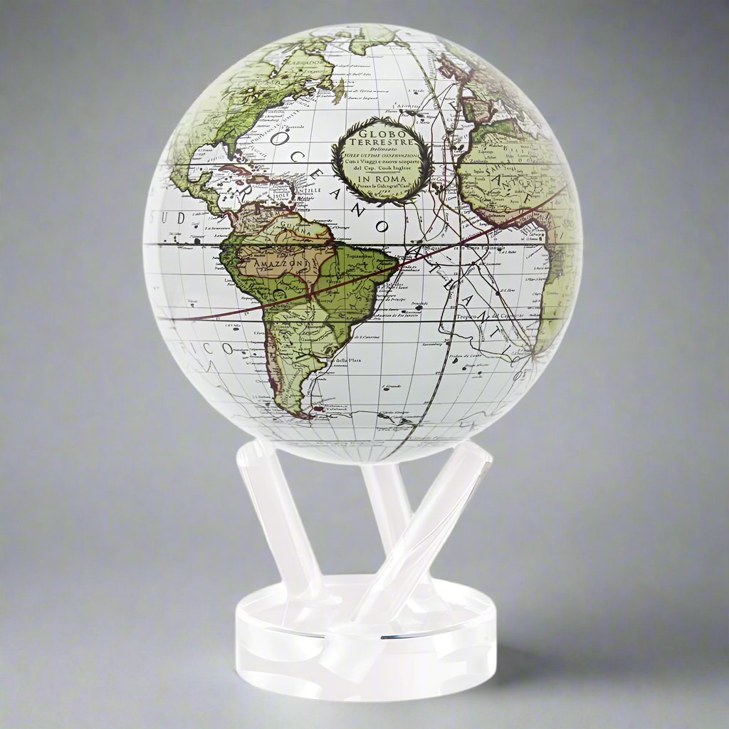 The Antique Terrestrial White MOVA Globe is a unique blend of past and present, featuring a vintage 1790 map with modern updates. Notably, this map includes the early United States, a rare feature in maps of that time. With effortless, independent rotations, this globe brings history to life in any setting.