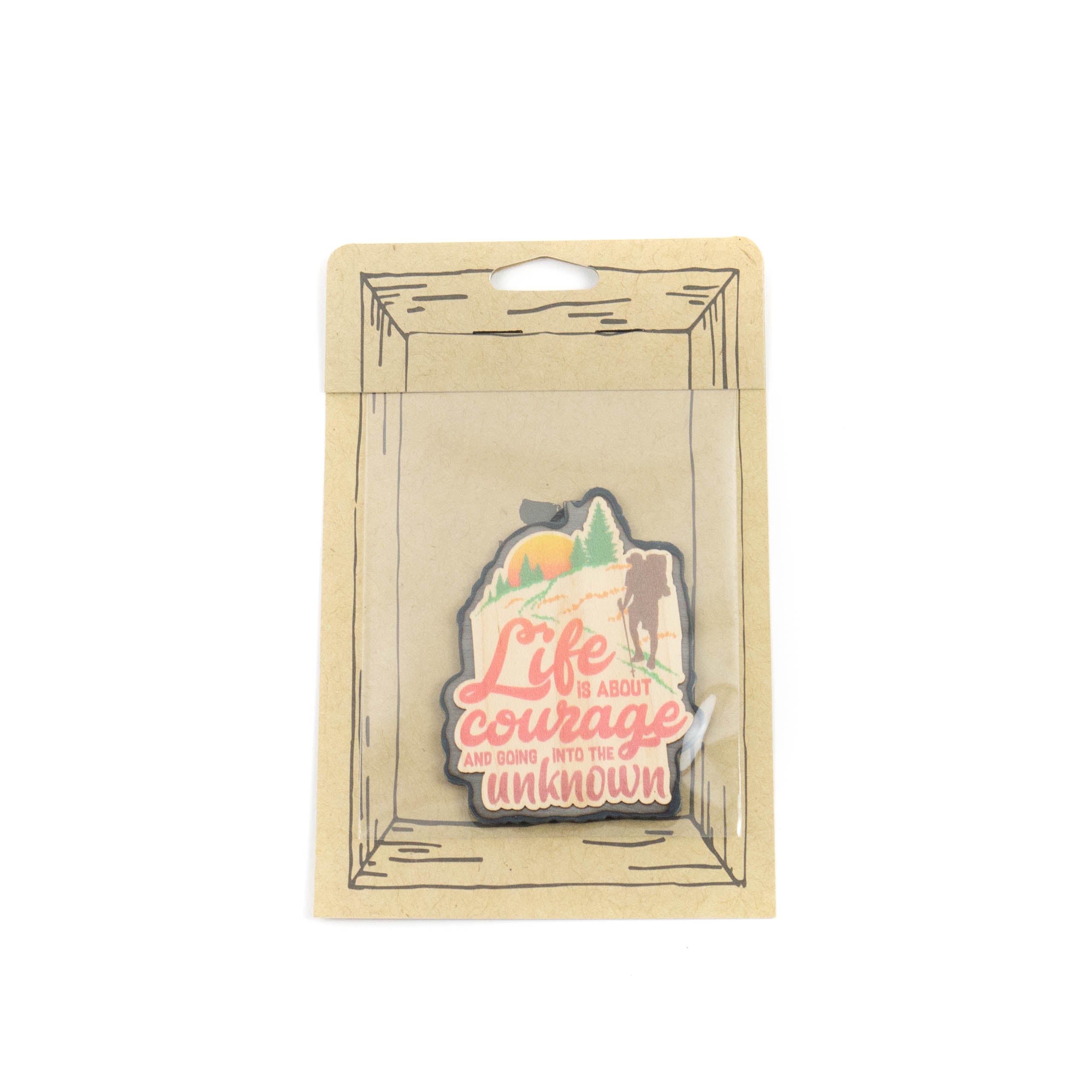 Life is about courage and going into the unknown. Our surroundings are full of unknowns. Paths open to opportunity and adventure creates a life of happiness. Keep this as a reminder to stay true to who you are. With a metal back and a printed wooden front, you can hang this from the mirror in your car or anywhere you need a reminder at home! Grab yours today.