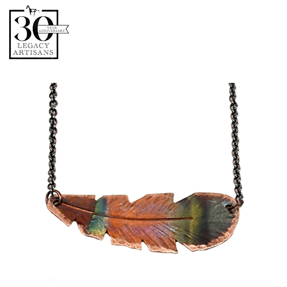 Each item made by RoseWorksMT is unique in its own right. Starting with thin sheets of metal, in this case copper, and heating them to create the unique color scheme, you can take pride in knowing you're the only one wearing a necklace that looks exactly light this one. You're also supporting a small, family business that is inspired by the great outdoors of Montana. Whether a gift or for yourself, the Small Feather Necklace by RoseWorksMT is a must-have!