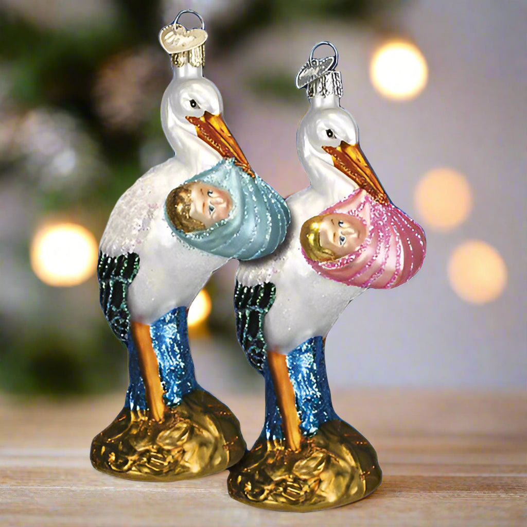 Celebrate the arrival of a new little one with the Bundle of Joy Ornament by Old World Christmas. Featuring a stork gracefully carrying a newborn in its beak, this ornament captures the pure joy and excitement of welcoming a baby. Hand-painted with soft, delicate colors and finished with a gentle touch of glitter, this blown-glass ornament is the perfect keepsake to commemorate the special moment.