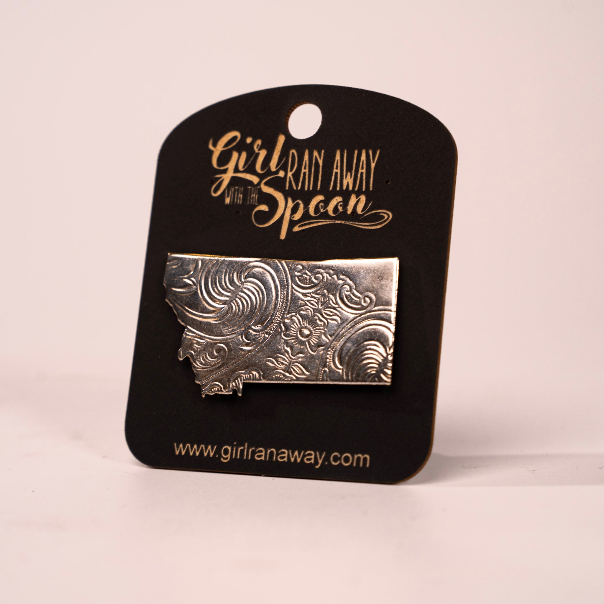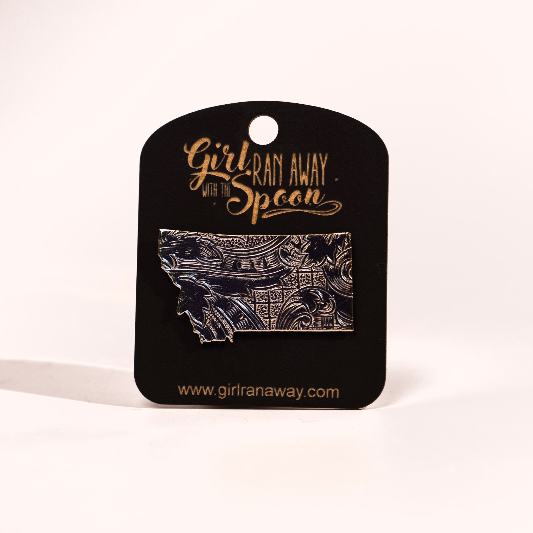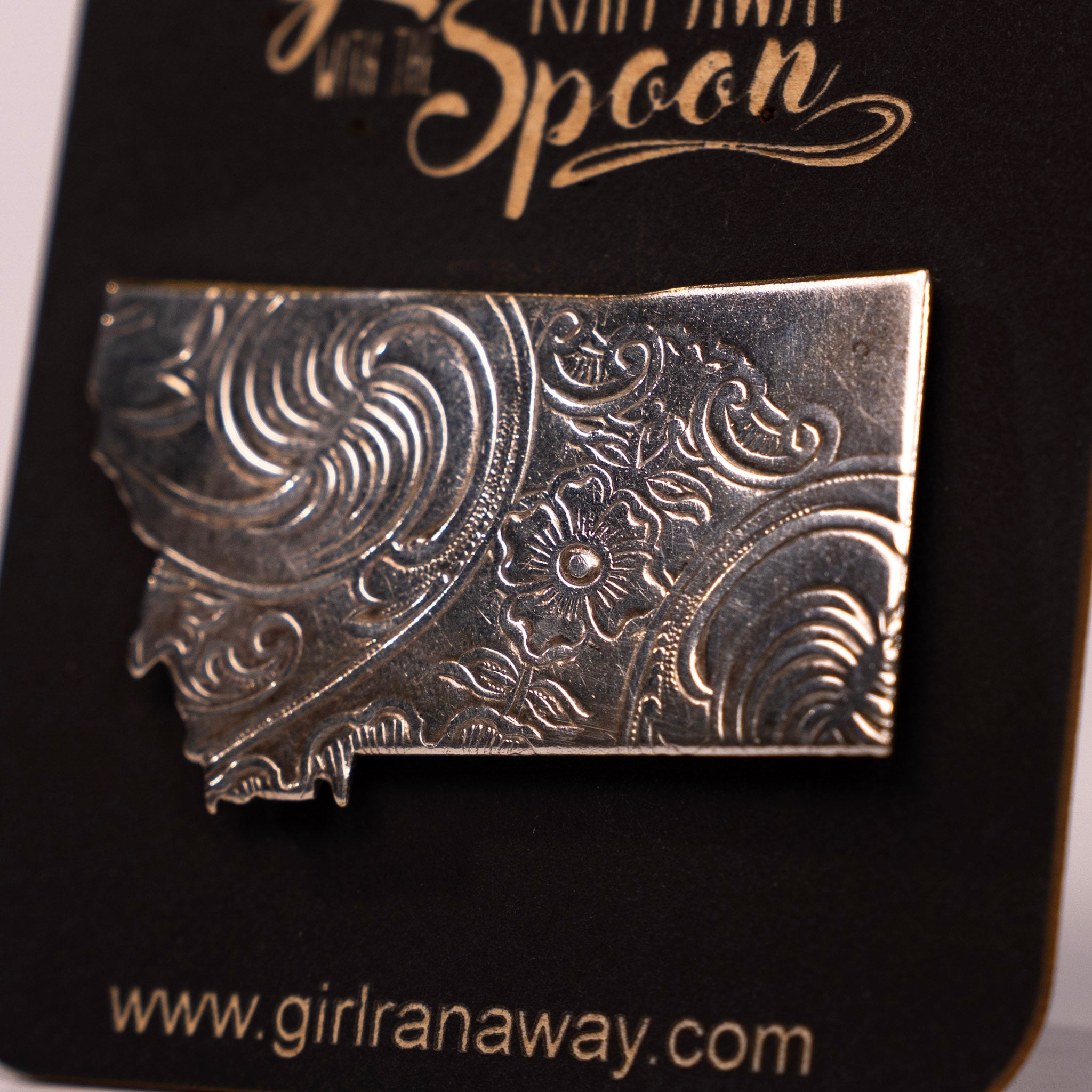 We might be a little biased, but we wholeheartedly believe that Montana is one of the greatest places on earth. From our gorgeous mountainscapes, to our range of wildlife, the opportunity for outdoor adventure, and so much more, there's no wonder why it is so beloved by locals and travelers alike! If you've been looking for the perfect Montana souvenir, you have arrived at the perfect place. Our Silver Tray Montana Tack Pin by Girl Ran Away with the Spoon is the perfect pick! These Montana-made tack pins are made from vintage silver trays and have a unique Montana shape that measures 2 inches wide. Plus, there's a practical double tack pin attached for a sturdy hold. Just a friendly reminder that while these photos give you an idea of our style, each pin is totally one-of-a-kind. So don't be surprised if your pin looks a little different - that's just part of its charm!