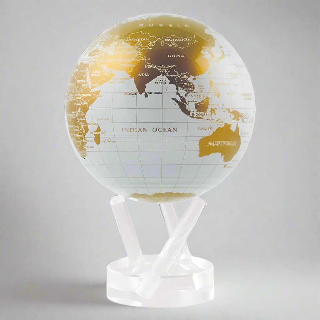 Looking for some classy decor for your office or home? This White and Gold MOVA Globe is the answer to your style desires! Powered by ambient light and hidden magnets inside, this MOVA globe rotates slowly with no cords or batteries.